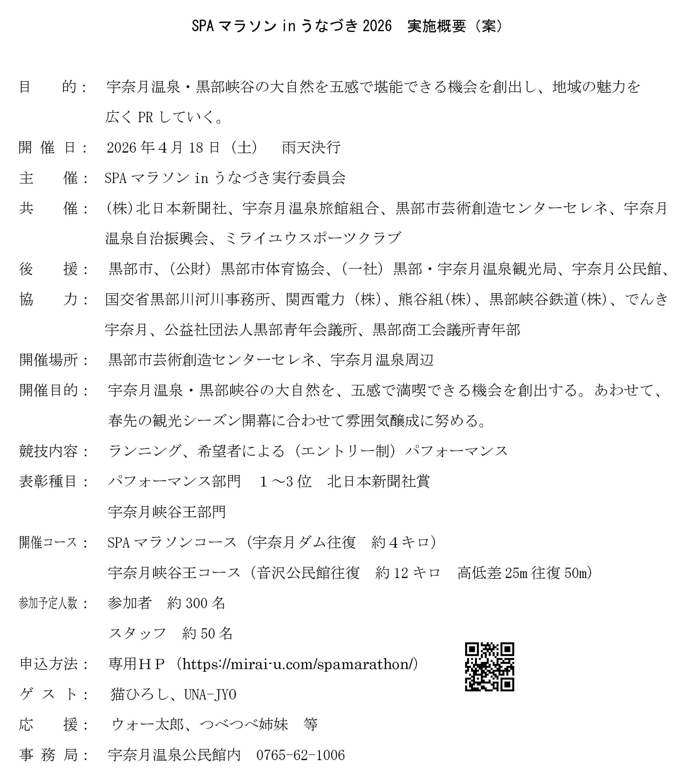 SPAマラソンinうなづき 2024.02.262025.10.28 参加申込にあたって、コチラの各規約に同意する必要があります。 お申し込みはコチラ↓ 【車】北陸自動車道「黒部I.C」から約15分 【電車】北陸新幹線「黒部宇奈月温泉」 → 富山地方鉄道「新黒部駅」 → 「宇奈月温泉駅」から徒歩5分